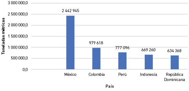 En la Figura 1 se puede observar los principales países productores de palta en el año 2021. De ellos, México lidera dicha producción con 2 442 944,64 toneladas métricas (TM); le sigue Colombia con una producción de 979 617,72 TM; Perú, con una producción de palta de 777 095,96 TM; Indonesia, con 669 260,46 TM; República Dominicana, con 634 368,16 TM de palta y Kenia, con 416 802,72 TM.