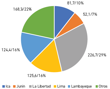 Como se puede observar en la Figura 2, La Libertad es la región que presenta mayor producción de palta a nivel nacional. Esto se debe al potencial agroexportador de la región, con presencia de grandes empresas agroexportadoras y asociaciones de productores. La Libertad reúne condiciones favorables para muchos de los cultivos estrella del boom de la agroexportación en el Perú. Sus condiciones climatológicas y edafológicas, así como su cercanía a los puertos de la costa y su infraestructura vial, han permitido un gran desarrollo productivo y tecnológico de cultivos como la palta.