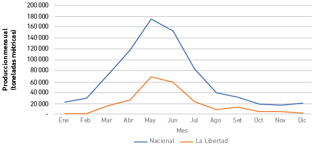 La Figura 3 muestra la ventana productiva de la región La Libertad y a nivel nacional, y se puede ver que en ambos casos se logra una producción pico entre los meses de mayo y julio. Esto permite una ventana comercial, sobre todo con la Unión Europea; además, brinda ventajas competitivas con respecto a México, que es el primer productor de palta del mundo dado que sus picos productivos no coinciden con los de Perú.