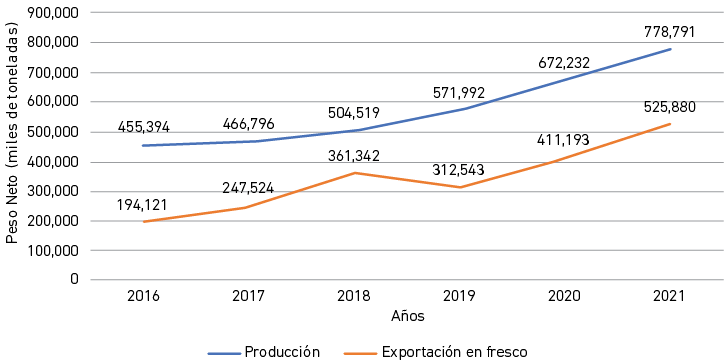 La Figura 5 muestra las cantidades en peso producidas y exportadas de palta a nivel nacional durante el periodo 2016-2021.