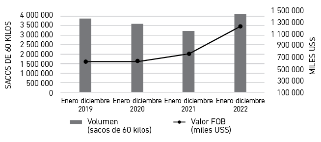 Valor y volumen de exportación de café (2019-2022)