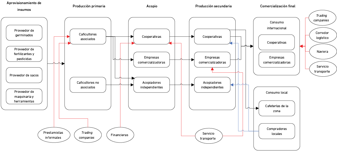 La mayor parte de la producción del café se destina a la exportación. En menor cantidad se dirige a las cafeterías locales para el consumo en la zona o también para vender a compradores locales que desean adquirir los granos de café verde. A continuación, se muestra la Figura 2, que es la CSC actual, la cual ha sido diagramada según la información obtenida a partir de las entrevistas y del análisis del sector realizado.
