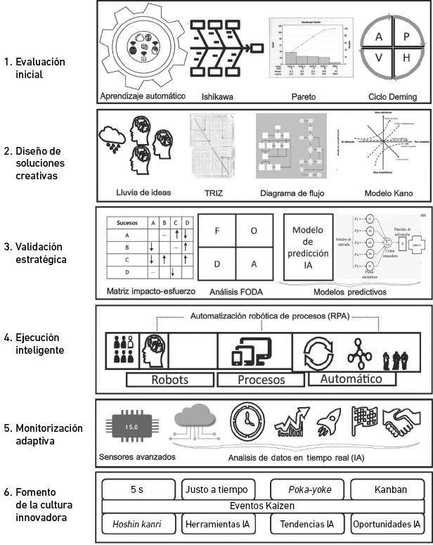 Por ejemplo, se organizan eventos Kaizen en los que los empleados de diferentes departamentos colaboran para identificar posibles mejoras en los procesos. La IA analiza el flujo de datos de estas sesiones para detectar patrones y sugerir áreas de enfoque adicionales.