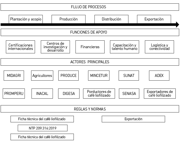 Se han contemplado como actores primarios a los participantes directos en el flujo de procesos necesarios en la elaboración y exportación del café liofilizado y como actores de soporte a aquellas entidades que participan indirectamente en el desarrollo de la cadena de valor, mediante la prestación de servicios, productos, asesorías y tecnología.