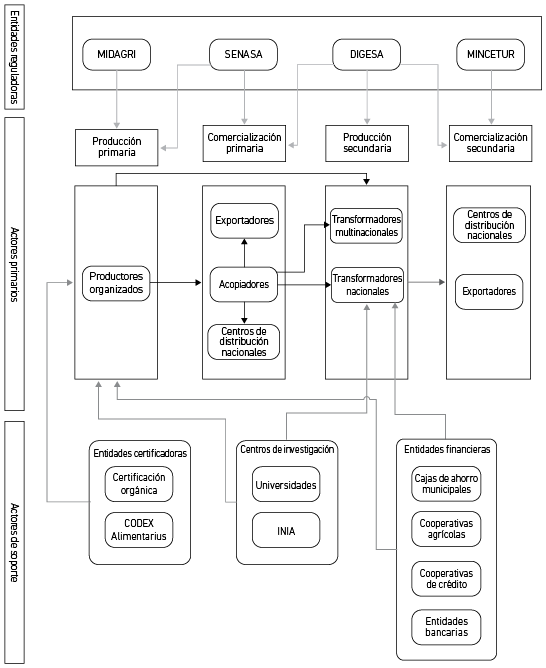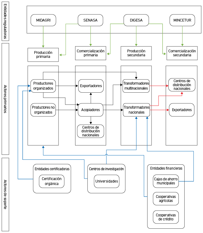 Una vez identificados los elementos de la cadena de valor, se procedió a relacionar actores principales, de apoyo y entidades regulatorias presentes en la Figura 4, de elaboración propia.