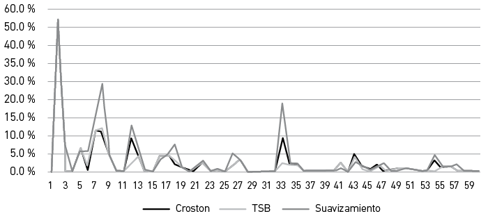 La diferencia con los otros métodos radica en que el modelo TSB realiza un seguimiento tanto en el nivel de la demanda como en la probabilidad de la demanda. Es por ello que genera un menor nivel de error. Como se observa en la Figura 4, el método de TSB genera un menor error (por debajo del 20 %), mientras que el método de SE llega a un pico de 50 %.