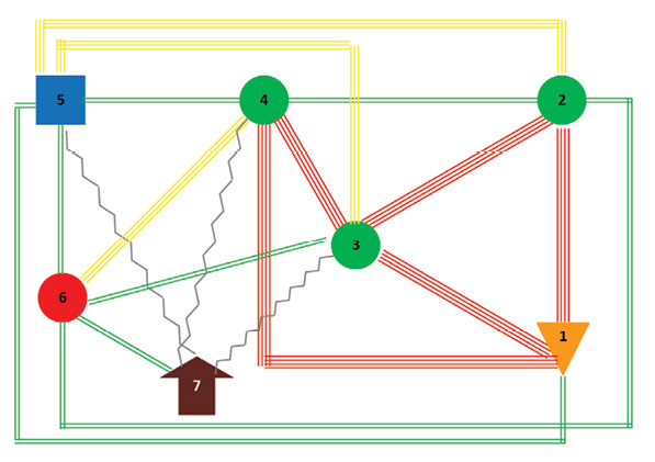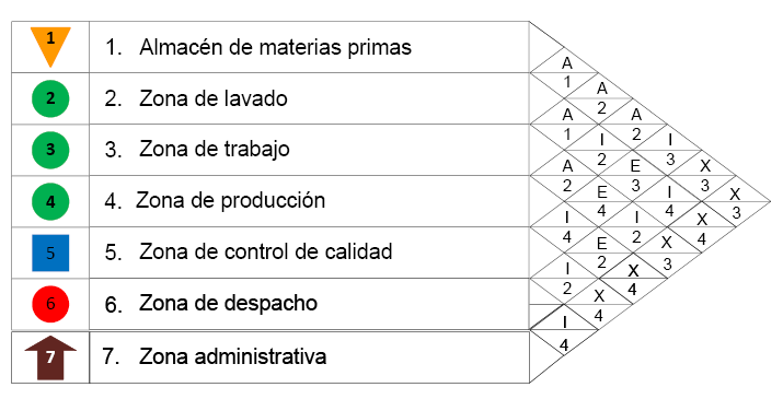 Como se puede ver en la Figura 7, las relaciones más importantes se encuentran entre el almacén de materias primas (1), la zona de lavado (2), la mesa de trabajo (3) y, finalmente, la zona de producción (4), dado que son zonas que deben estar cerca para generar eficiencia y rapidez, considerando que el proceso parte desde el almacén de materias primas. Además, como muchos de los insumos más importantes deben ser lavados o, incluso, llevados a la mesa de trabajo directamente, se enfatiza la cercanía de estas zonas (1, 2, 3 y 4) para realizar con mayor rapidez estos procesos. Asimismo, otra relación importante está entre la mesa de despacho (6) y la zona administrativa (7). Esta última sirve para verificar, a través de la computadora o pizarra, que los pedidos cuenten con todos los requisitos solicitados por los clientes.