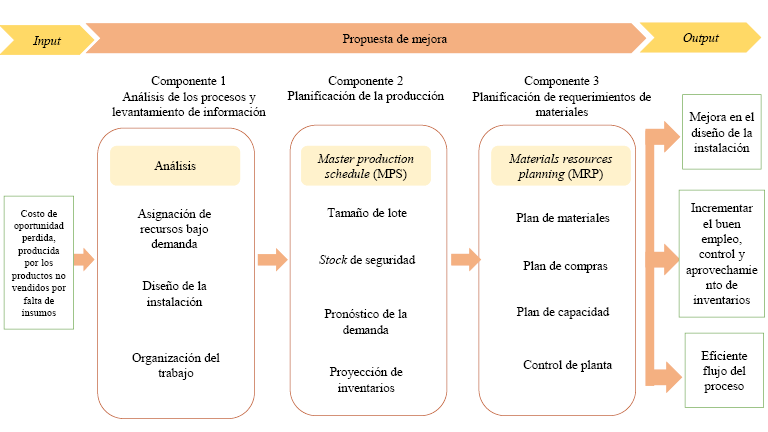 En la Figura 1, se puede observar el diagrama de la metodología, la misma que se encuentra dividida en tres componentes. El primero se enfoca en el análisis de los procesos y el levantamiento correspondiente de la información, el segundo toma como referencia la planificación de la demanda y, por último, el tercero se enfoca en la planificación de requerimientos de almacén.