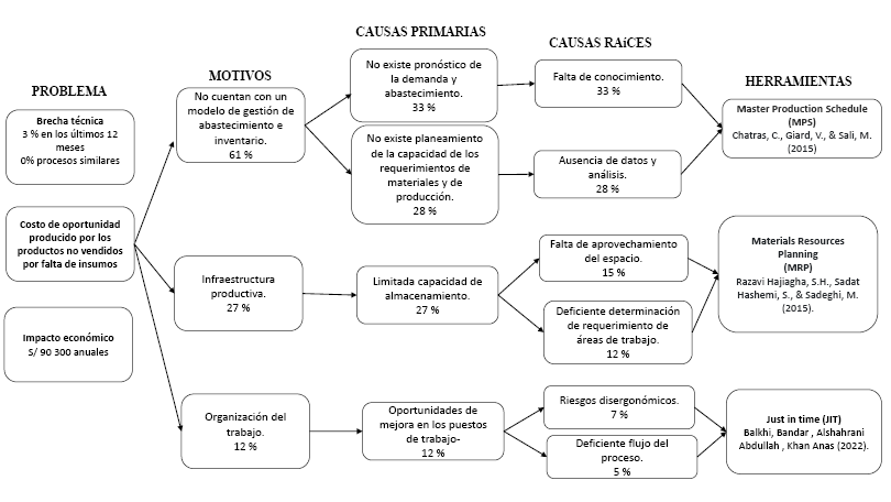 Tal como se muestra en la Figura 2, se analizaron los tres motivos principales que originan los pedidos perdidos. Tomando en cuenta la frecuencia y el impacto económico de cada uno de ellos, se empezó por abordar el relacionado al modelo de la gestión de abastecimiento e inventario. Además, debe tomarse en consideración que JIT se identificó como una causa probable, pero no se abordó, porque el foco del trabajo es el planeamiento y el control de las operaciones.