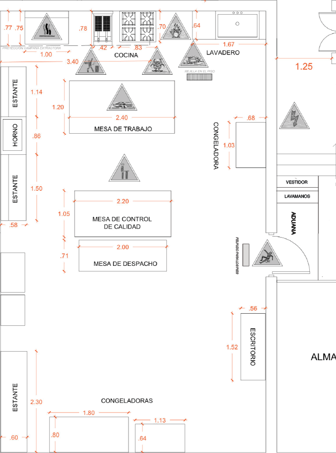 Finalmente, definido el diagrama relacional de actividades, se realizó la nueva disposición de planta, cuyo resultado se muestra en la Figura 9. De igual manera, el plano completo de las instalaciones se muestra en la Figura 8, donde se observa los baños y áreas externas sobre las cuales no se ha realizado ninguna modificación, ya que esto requeriría una inversión en obra civil que la empresa no puede efectuar. Por otro lado, los cambios propuestos más importantes en la zona de cocina son la eliminación de una repisa y una congeladora adicional en un almacén lo suficientemente grande para las materias primas cerca de la zona de producción, la inclusión de la mesa de control de calidad separada de la mesa de despacho y la ubicación de la zona administrativa en una posición que permite el control de entradas y salidas.