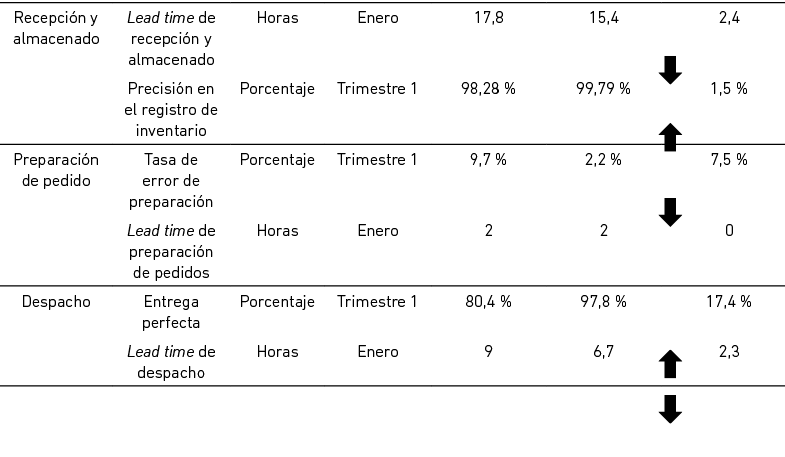 En el ámbito de la medición, se implementó un sistema de vigilancia del rendimiento basado en indicadores sólidos que respaldaron decisiones fundamentadas en datos y aseguraron la calidad de los procesos (véase la Figura 1). La elección cuidadosa de indicadores clave de desempeño (KPI) se convierte en un componente crucial para la gestión efectiva, pues permite tomar decisiones informadas y fomentar mejoras continuas (Mora, 2019). Los indicadores a medir abarcan aspectos como la rotación de mercancía, tasa de precisión del pronóstico, lead time de planeación (importación), lead time de reposición de stock, lead time de compras, calidad de los pedidos generados, lead time de recepción y almacenado, precisión en el registro de inventario, tasa de error de preparación, lead time de preparación de pedidos, entrega perfecta y lead time de despacho.