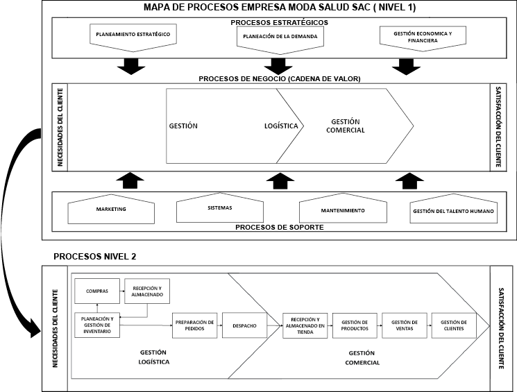 Moda Salud es una empresa que ha adoptado la gestión por procesos para avanzar en su mejora continua. La primera etapa, basada en el ciclo PHVA, implicó la planificación y mapeo de los procesos clave de la empresa alineados con su misión y visión. Estos procesos fueron clasificados en tres categorías: estratégicos, de negocio y de soporte (véase la Figura 4).