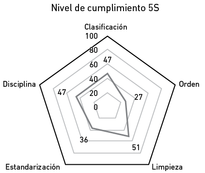 Además, se comparó los resultados obtenidos y el porcentaje ideal para cada apartado de la metodología aplicada. Esto se representó mediante un diagrama radial que expone el nivel de cumplimiento de las 5S, tal como se observa en la Figura 1. La línea gruesa externa del diagrama representa el 100 % de cada criterio de evaluación de la metodología 5S, que sería el objetivo ideal. En contraste, la línea gruesa interna muestra los resultados obtenidos, lo que subraya la necesidad de mejorar el sistema actual.