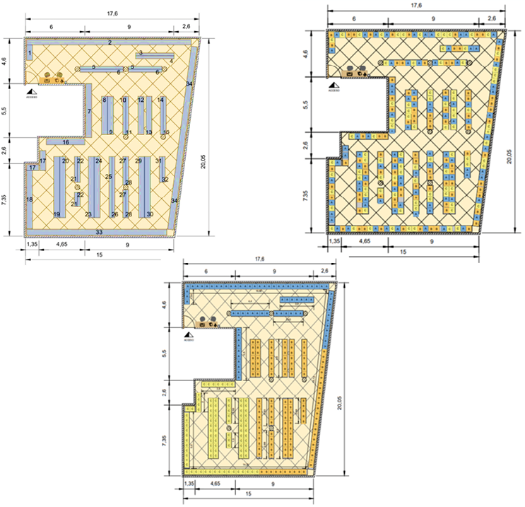 En la Figura 5, de izquierda a derecha se observa el plano del almacén que se realizó para identificar áreas y espacio; en el plano del centro se observa cómo estaba la ubicación antes de los cambios. En la última imagen (derecha) se presenta la zonificación basada en los datos de la clasificación ABC como propuesta de mejora. Cabe anotar en los planos que el espacio físico del almacén no es rectangular, por lo cual fue difícil generar propuestas, pero la alternativa de distribución buscó que el uso del espacio diera un máximo aprovechamiento del área a partir del análisis riguroso (Villamil, 2024).
