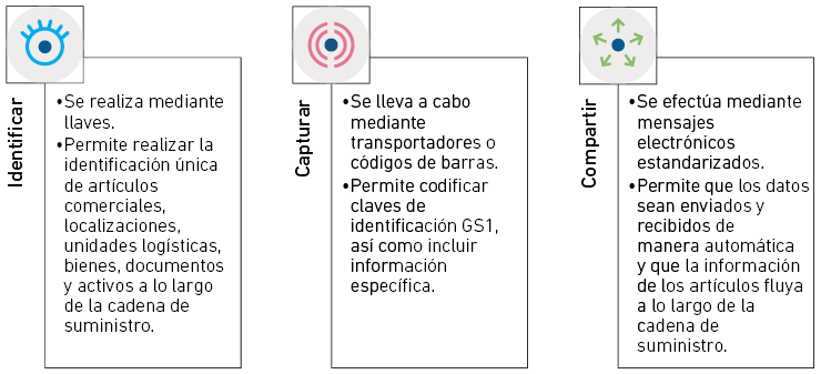 Los estándares GS1 son el lenguaje común para identificar, capturar y compartir los datos a lo largo de la cadena de suministro, asegurando que la información importante sea accesible, precisa y fácil de entender (GS1 Spain, s. f.). Como constituyen una forma estandarizada, posibilitan un mayor entendimiento y mejora significativa de la eficiencia y competitividad de los diferentes procesos en los sectores industriales que los utilizan. Los estándares GS1 pueden dividirse en tres pilares cuyas características y funciones se muestran en la Figura 1.
