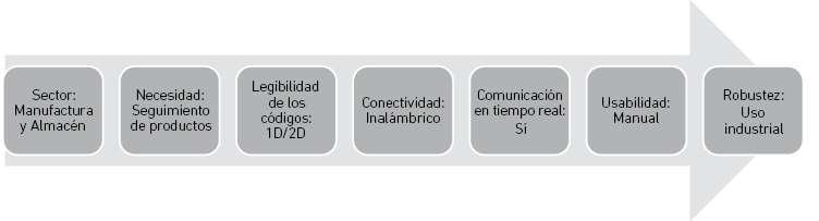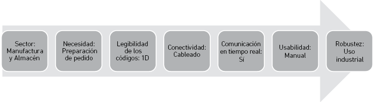 Estos atributos se definen a partir de las características propias de la empresa y del proceso analizado. Se selecciona como sector el de manufactura y almacén, debido a que el análisis se realiza en el almacén de productos terminados de la Empresa A. La necesidad es la del proceso de picking o preparación de pedidos, por ser uno de los procesos que tienen lugar en este almacén. La fase de acondicionamiento de los pedidos ocurre en un lugar específico del almacén, luego de realizados los recorridos para la recogida de la mercancía. Los códigos empleados por la empresa en los envases primarios para sus diferentes productos son EAN-13, un tipo de código unidimensional; por eso, se buscan lectores de códigos que cumplan con esta funcionalidad exclusivamente. En cuanto a la conectividad, se requiere de un lector de códigos cableado, pues, una vez que los productos estén ubicados en el mismo lugar, se procede al escaneo y, con comunicación en tiempo real, los datos pueden ser registrados en el sistema ERP utilizado por la empresa e ir descontando los artículos que conformarán el pedido. Se define un lector manual para que un operario pueda utilizarlo y escanear cada producto durante el proceso de preparación de pedidos. Respecto a la robustez, se quiere una tecnología de uso industrial por el ambiente en el que será utilizado.