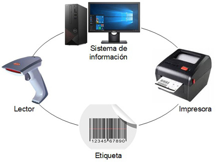 Para el funcionamiento de un sistema de código de barras, se necesita una serie de componentes, los cuales se muestran en la Figura 2. Como elemento inicial, es necesario tener la etiqueta con el código que se haya determinado para el artículo en cuestión; se la imprime utilizando impresoras específicas, y se la adhiere a los objetos que se va a identificar o, en ocasiones, se la incluye en el envase o embalaje del producto. Posteriormente, cuando se requiere conocer la información contenida, se lee la etiqueta con el lector: su láser empieza a leer el código de barras en un espacio blanco, continúa pasando hasta la última línea y termina en el espacio blanco siguiente, lo cual activa el sistema de información, recupera y registra la información relacionada.