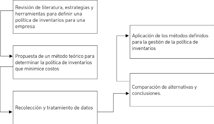 La investigación siguió un proceso estructurado, mostrado en la Figura 1, que comenzó con una revisión de literatura para explorar estrategias y herramientas existentes en la gestión de inventarios. Posteriormente, se propuso un método teórico para minimizar los costos de inventario y se llevó a cabo la recolección y tratamiento de datos necesarios para aplicar y validar este método. El proceso investigativo culminó en la aplicación práctica de los métodos definidos y una evaluación comparativa de estrategias para determinar la más eficiente y efectiva para la empresa. Este enfoque sistemático y basado en datos subraya la importancia de una planificación cuidadosa y adaptativa en la gestión de inventarios.