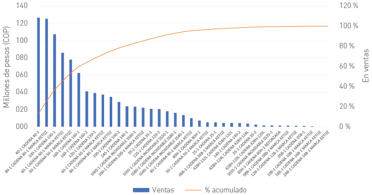 En la Figura 2, se presenta el análisis de Pareto que indica las cinco referencias más vendidas: cadenas 40-1, 80-1, 100-1, 60-1 y 160-1. Basándose en estas referencias, se desarrollarán tres escenarios que consideran los costos operativos, evaluando tanto la situación actual como escenarios hipotéticos con demanda estocástica y demanda determinística.
