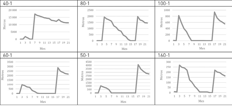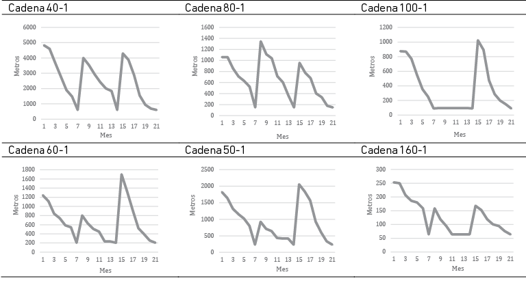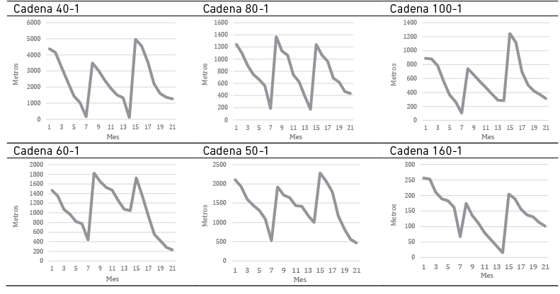 En la Figura 3 se observa la variabilidad en el inventario de la cadena 40-1: ausencias totales de stock durante cuatro meses y niveles bajo 5000 metros en los primeros seis meses. Aumentos significativos ocurren en los meses 3, 7 y 17, más notable en el mes 7, cuando el inventario supera los 15 000 metros. Si bien se incrementan los costos de mantenimiento, se reduce la necesidad de pedidos futuros. En contraste, la cadena 80-1 tiene un patrón más estable, con alrededor de 2000 metros, pero enfrenta tres meses de desabastecimiento antes de cada pedido, lo que afecta las ventas. La cadena 100-1 muestra 10 meses sin inventario, lo que indica pérdidas significativas en ventas. Las cadenas 60-1 y 50-1 reflejan variabilidad, con pedidos que aumentan considerablemente tras periodos sin stock, mientras que la cadena 160-1 tiene dos importantes recepciones de mercancía, aunque el último pedido fue menor pese a la escasez previa, desviándose de la política habitual de aumentar pedidos tras un desabastecimiento.