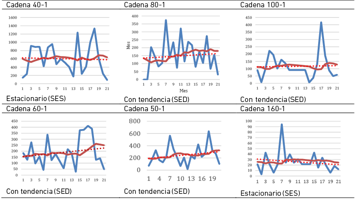 Para la heurística Silver-Meal, en la cual se evalúa en qué periodo es más económico pedir la demanda de los siguientes hasta que se alcance la demanda esperada (Nahmias, 2007). Para el cálculo de pronósticos, se evalúa la tendencia que siguen las ventas de los 21 meses. Puede haber cuatro tipos de comportamiento: estacionario, con tendencia, con estacionalidad, y con tendencia y estacionalidad. Después de eso se determina el método de pronóstico por analizar.