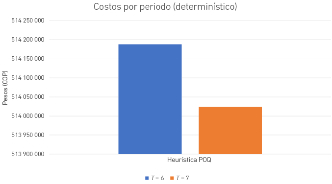 En la comparación de las dos mejores instancias para el método determinístico, que se expone en la Figura 8, se evaluaron los periodos T = 6 y T = 7. Al analizar los costos, se encontró que realizar pedidos cada siete meses permite a la empresa ahorrar $ 164 256,65. Aunque este ahorro no es considerablemente alto, contribuye a la reducción de costos operativos. Por lo tanto, se decidió adoptar un ciclo de pedido de cada siete meses (T = 7) como la estrategia más costo-efectiva.
