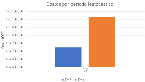 La Figura 9 muestra una comparación de los costos operativos para dos periodos de revisión del inventario bajo un escenario estocástico, específicamente con ciclos de pedido T = 7 y T = 6. En el gráfico, se observa que el costo total para el ciclo T = 7 es aproximadamente $493 700 000, mientras que para el ciclo T = 6 es cercano a $494 300 000, lo que evidencia un ahorro al optar por un ciclo de pedido más largo (T = 7). Aunque la reducción no es significativamente grande, representa una disminución en los costos operativos en comparación con el ciclo más corto (T = 6).