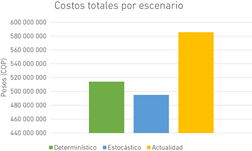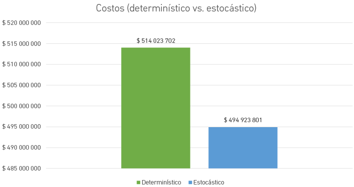 La Figura 10 ilustra una comparación de los costos totales asociados con dos enfoques de gestión de inventario: determinístico y estocástico. Según el gráfico, el enfoque determinístico incurre en un costo considerablemente más alto, que asciende a $514 023 701,52, en comparación con el enfoque estocástico, que presenta un costo de $493 665 514,31. Esto sugiere que, en este caso, el enfoque estocástico es más eficiente desde el punto de vista de costos, ahorrando aproximadamente $20 358 187,21, lo que indica una ventaja económica en optar por métodos que consideren la variabilidad y la incertidumbre inherentes en la gestión del inventario.