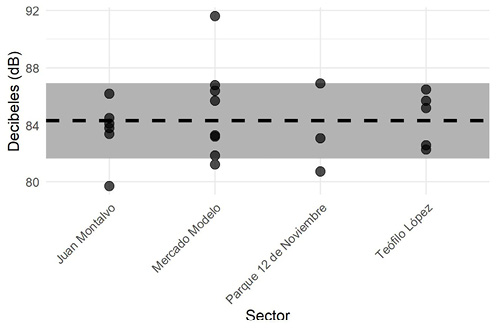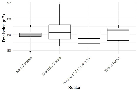 En la Figura 4, se puede observar que, de manera general, las cajas presentan una dispersión reducida, lo que indica que no existe mucha variabilidad en los datos. Cabe destacar que se puede verificar, con la mediana (línea horizontal en la parte interna de la caja), que los niveles de ruido en los sectores del Mercado Modelo y Teófilo López son superiores a la media (84,3 dB). Esto sugiere que existen picos de ruido muy altos y, por lo tanto, es muy probable que las afectaciones auditivas sean más significativas en ese sector.