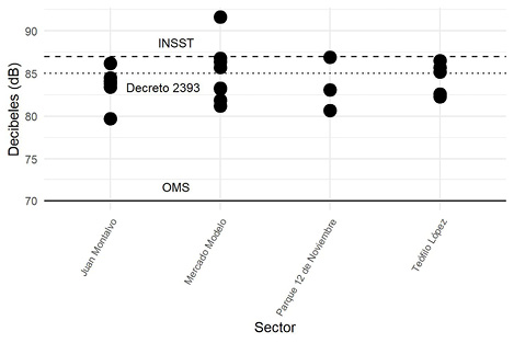 La exposición prolongada al ruido depende del tipo de trabajo que se realice; no obstante, las normativas del INSST, el Decreto Ejecutivo 2393 y la OMS deberían realizar un análisis según el contexto. En este caso, sería fundamental establecer parámetros sobre los límites máximos permisibles en locales comerciales ubicados en zonas céntricas de una ciudad, donde el ruido ambiental sea considerado un agente directo de afectación. Además, esto cobra mayor relevancia cuando se utilizan generadores eléctricos que, debido a la falta de energía, generan un nivel de ruido adicional al habitual.