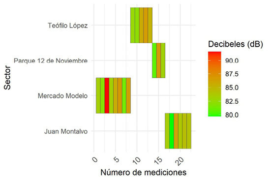 Nota. Los datos fueron procesados utilizando el software R. Los niveles de ruido según los sectores son representados con base en una escala cromática, en la que los tonos más intensos representan niveles de ruido altos y los tonos suaves indican los niveles de ruido bajos.