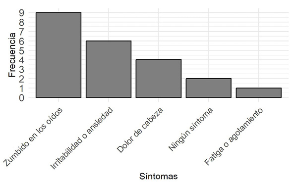 Con respecto a las preguntas formuladas a las personas que participaron luego de realizar las mediciones de ruido, se obtuvieron algunos resultados que llamaron la atención sobre la sintomatología en las personas. En la Figura 7, el síntoma con mayor incidencia fue el zumbido en los oídos, lo cual, en términos porcentuales, representó el 40,9 % de la muestra establecida. A pesar de que la normativa, tanto internacional como nacional, define niveles de ruido y tiempo de exposición sobre la base de criterios técnicos, estar expuesto al ruido de manera prolongada en un intervalo de tiempo genera algunas consecuencias en la salud de los trabajadores. Por esta razón, es de suma importancia contar con medidas preventivas o un plan de acción en caso de que se repita el uso de los generadores eléctricos cuando existan cortes de energía eléctrica.