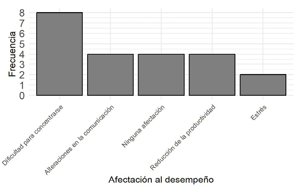 Al estar expuestos al ruido, no necesariamente se afecta la salud física de los trabajadores; sin embargo, indirectamente se generan afectaciones en el desempeño laboral, lo que hace que las actividades no se ejecuten adecuadamente. Por ende, otra pregunta planteada a las personas que participaron en el estudio estuvo relacionada con el desempeño. En la Figura 8, se puede observar que la afectación más significativa fue la dificultad para concentrarse, lo cual, en términos porcentuales, representa el