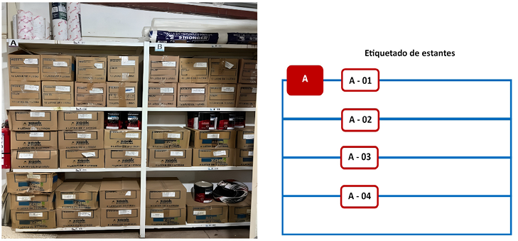 Nota. A = nombre que se le asignó a cada estante, es decir una letra del alfabeto. A-01, A-02, A-03 y