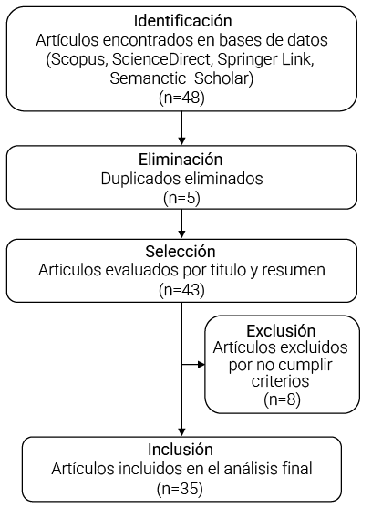 El proceso de selección de estudios siguió las directrices del modelo Prisma 2020 (Preferred Reporting Items for Systematic Reviews and Meta-Analyses). Inicialmente, se identificaron 48 registros mediante la búsqueda en las bases de datos Scopus, ScienceDirect, SpringerLink y Semantic Scholar, utilizando la ecuación de búsqueda mencionada anteriormente en idioma inglés.