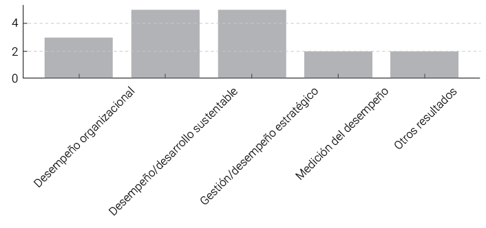 En relación con las métricas de rendimiento evaluadas en los estudios analizados, se encontró que once de los 35 estudios revisados hicieron mención explícita a indicadores de desempeño como parte de sus resultados. Dentro de las métricas abordadas, el desempeño financiero fue el indicador más frecuente, mencionado en siete estudios, evidenciando el énfasis tradicional del balanced scorecard en la dimensión económica de las organizaciones. En menor medida, se observaron referencias al desempeño organizacional (dos estudios), al desempeño estratégico (un estudio) y al desempeño sostenible (un estudio), lo que sugiere una diversificación incipiente de los intereses evaluativos hacia aspectos no financieros.