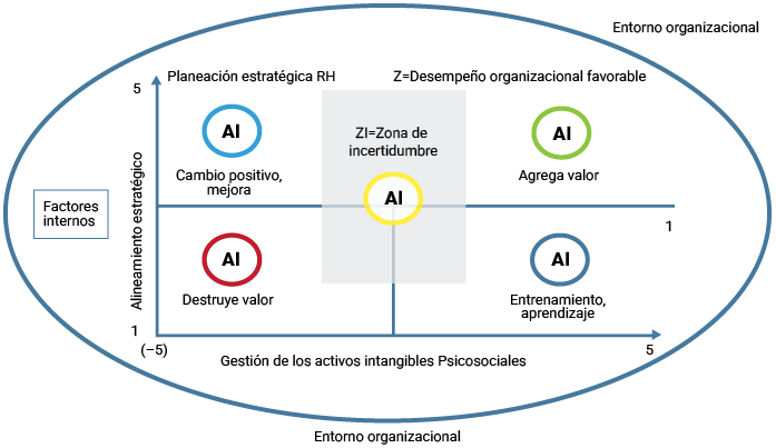 En cuanto al grado de alineamiento estratégico entre la gestión de los activos intangibles psicosociales y la estrategia de recursos humanos, se construyó una matriz que integró los resultados obtenidos teniendo en cuanta lo aportado por Comas Rodríguez et al. (2022), Montané Marsal y Cuesta Santos (2023). El valor ponderado alcanzado para la gestión de los AIP fue de 3,27, clasificado como “alto”, mientras que el alineamiento estratégico obtuvo una puntuación de 3,50, también en la categoría de “alto”. La intersección de ambos valores en la matriz posicionó el resultado dentro de ZI=zona de incertidumbre, cuadrante que indica un alineamiento aceptable, aunque aún con margen para el desarrollo organizacional.