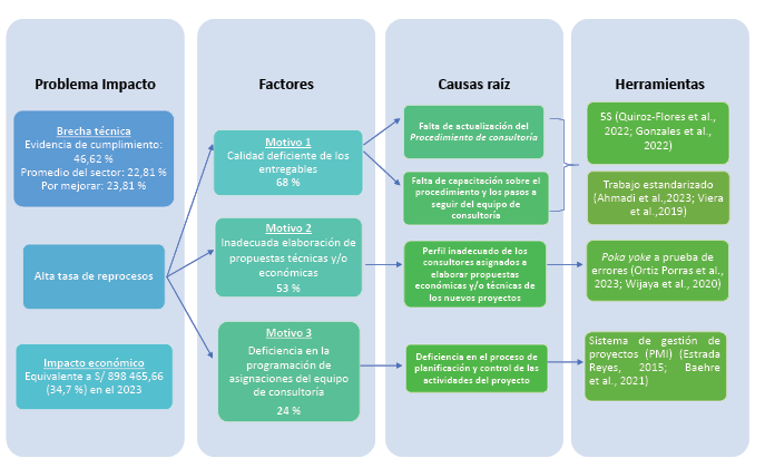 Estas técnicas son especialmente relevantes en entornos donde la precisión en los entregables y la eficiencia operativa resultan determinantes. Según Antony et al. (2021), su implementación contribuye significativamente a la reducción de tiempos de espera y a la eliminación de errores costosos, factores críticos en el sector consultoría. Asimismo, Manzanares-Cañizares et al. (2022) resaltan que su uso no solo disminuye fallos operativos, sino que también impulsa una cultura organizacional orientada a la mejora continua. En este sentido, Kääriä y Shamsuzzoha (2024) subrayan que estas herramientas permiten estandarizar procesos y aumentar la confiabilidad de sus entregables, aspectos de suma importancia para elevar la competitividad y la calidad del servicio en empresas del rubro. En concordancia con lo anterior, Machado Campos e Souza et al. (2023) sostienen que la aplicación de lean office en entornos administrativos estandariza los flujos de trabajo y elimina actividades sin valor agregado. Asimismo, Ciano et al. (2020) plantean que la integración sistemática de tecnologías emergentes asociadas a la industria 4.0 con principios lean favorece la reconfiguración de los procesos operativos, permitiendo niveles superiores de eficiencia, adaptabilidad y sincronización en entornos digitalizados, visión complementada por Trebuna et al. (2023), quienes destacan que esta convergencia incrementa la flexibilidad y fortalece la capacidad de respuesta organizacional.