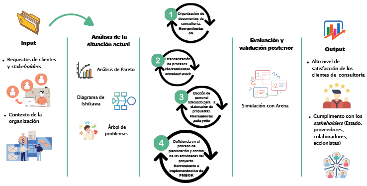 Para responder a las anteriores interrogantes, se analizará el proceso actual de consultoría para obtener un diagnóstico, seguido por el diseño de una propuesta de solución basada en las herramientas lean y principios del PMBOK. Posteriormente, se validará la propuesta mediante simulaciones y la medición de indicadores clave de desempeño. Finalmente, se evaluará la sostenibilidad económica de la implementación, considerando costos y beneficios a largo plazo derivados de la implementación de lean.
