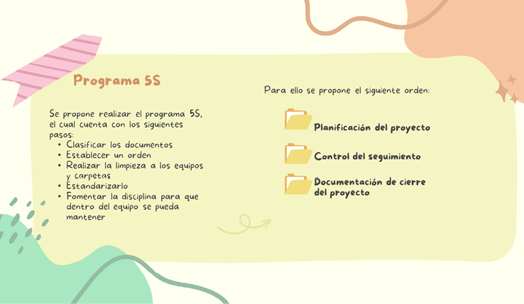 A partir de los hallazgos obtenidos en la primera etapa, se procedió a diseñar una solución basada en el modelo de gestión de lean office, para lo cual se seleccionaron herramientas alineadas con las necesidades de la empresa, reforzado por la investigación realizada por Mancera (2020), quien evidenció mejoras en la eficiencia operativa al aplicar este enfoque en procesos administrativos. Entre ellas, se implementó la metodología 5S en el ámbito digital, con el propósito de mejorar la organización documental y reducir tiempos de búsqueda; el trabajo estandarizado basado en los estándares del PMBOK, con el fin de establecer procedimientos claros que minimicen la variabilidad en la entrega de servicios; y un sistema de gestión de proyectos (SGP), fundamentado en los estándares PMBOK, que permite una planificación más eficiente y un mejor control de tareas.