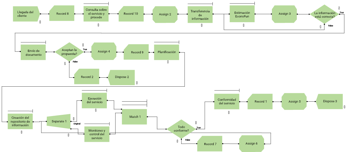 Para la fase de validación, se realizó una simulación en el software Arena, donde se analizaron errores, tiempos de reproceso y el impacto de la implementación de lean office en la eficiencia operativa. La Figura 6 muestra el modelo inicial, correspondiente a la situación actual sin intervención, donde se observa la estructura operativa original con sus tiempos y reprocesos. Por otro lado, la Figura 7 presenta el modelo mejorado tras la implementación de las herramientas, el cual destaca cambios en los flujos, una reducción de errores y una mayor eficiencia.