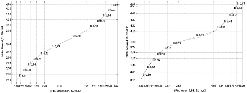 Figures 3,4, and 5 illustrate the graphical relationships among the variables for the TPM→jidoka relationship in H1, the TPM→ENSU relationship in H2, and the jidoka→ENSU relationship in H3, respectively. These plots effectively demonstrate the variation in β values on a five-point Likert scale.