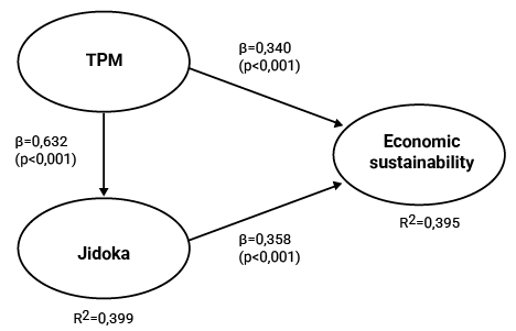 The analysis demonstrates a direct and positive relationship between TPM and ECSU, with a standardized coefficient of β=0,340 (p<0,001), accounting for 19,1 % of ECSU variability. Additionally, TPM exerts an indirect effect through jidoka, with a coefficient of β=0,226, culminating in a total effect of 0,565 and explaining up to 31,9 % of the ECSU variability.