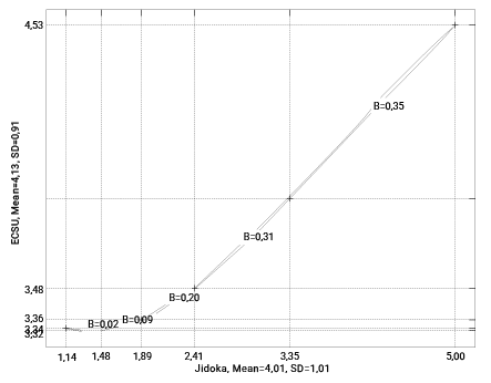 The findings clearly indicate that jidoka exerts a direct and positive influence on ECSU (β=0,358, p<0,001), accounting for up to 20,4 % of its variability. Figure 5 depicts an exponential growth relationship, with coefficients rising from β=0,03 at initial levels to β=0,34 at higher levels of jidoka, which signifies an acceleration in economic benefits. This exponential pattern underscores key characteristics of jidoka, where initial economic gains remain modest due to the investments necessary to yield significant impacts. During the early stages, organizations built essential anomaly detection capabilities but experienced limited economic benefits because of the learning costs and initial investments in automated systems. As systems mature, however, a multiplier effect emerges; the capability to automatically halt production upon detecting defects results in exponential savings, prevents the mass production of defective products, reduces reprocessing costs, minimizes material waste, and enhances overall quality.