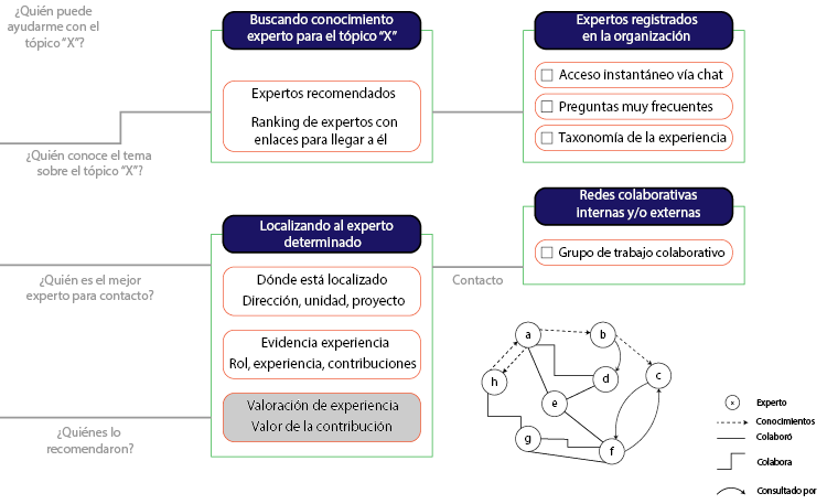 Uno de los primeros puntos a considerar, en la identificación del experto, es determinar los aspectos claves que gobiernan la localización, adquisición y transferencia del conocimiento individual y grupal con el experto. En el caso de la localización, es importante mapear los procesos por medio de los cuales se realizan los flujos de transferencia del conocimiento entre los diversos colaboradores y/o profesionales de una organización.