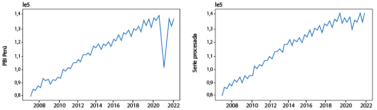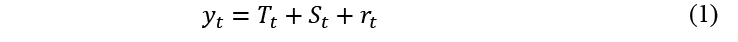 Se descomponen las series trimestrales (yt) en sus tres componentes: tendencia (Tt), estacionalidad (St) y residuo (rt) (ecuación 1). Estas se adicionarán al conjunto de datos como características. Para este propósito se aplica la técnica de descomposición STL (seasonal and trend decomposition using loess) debido a que es robusta para la detección de datos atípicos (Cleveland et al., 2021). En la figura 1 se ejemplifica este proceso.