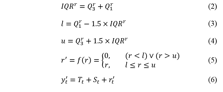 Se detectan los datos atípicos de los residuos aplicando la regla del rango inter-cuartil (IQRr y luego reemplazándolos por cero, como lo vemos en las ecuaciones 2 a 5. Con los residuos resultantes (