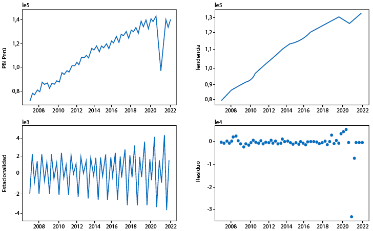 Nota. Resultado de descomponer la serie del PBI trimestral de Perú aplicando la técnica de descomposición STL.