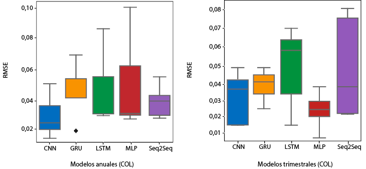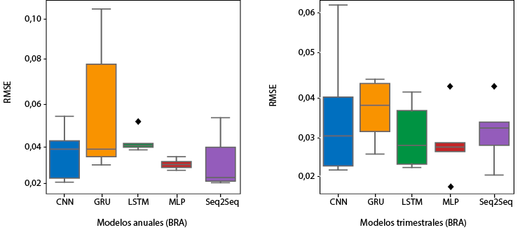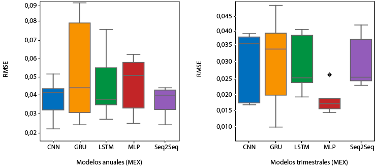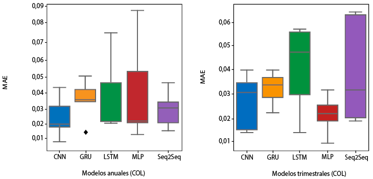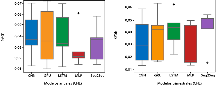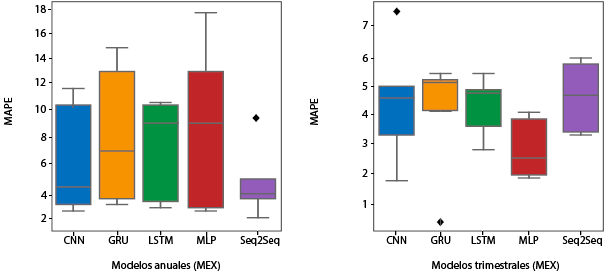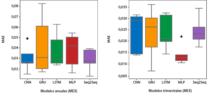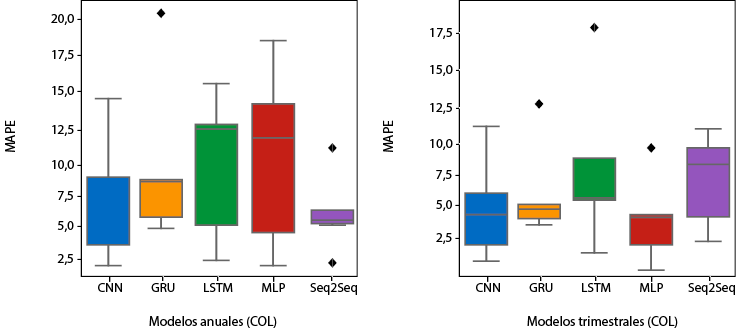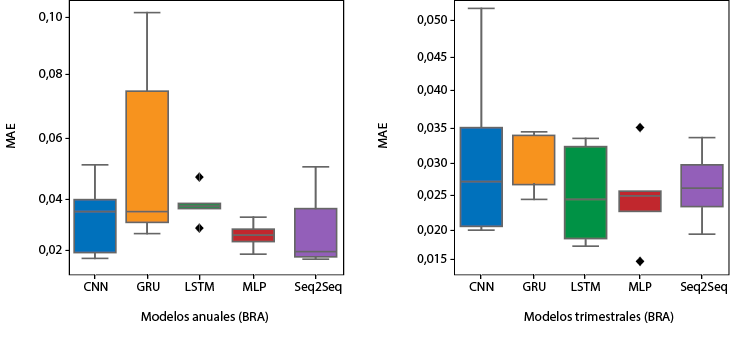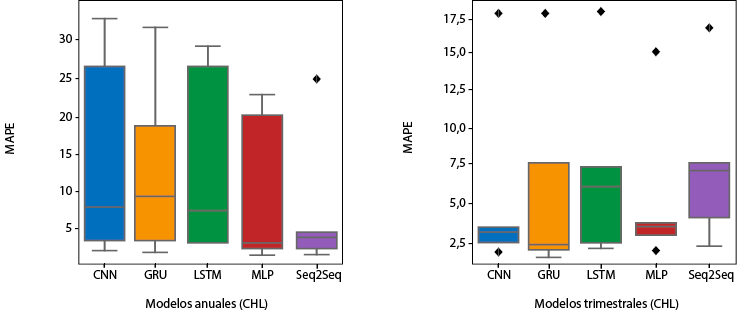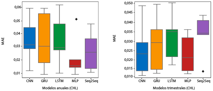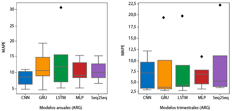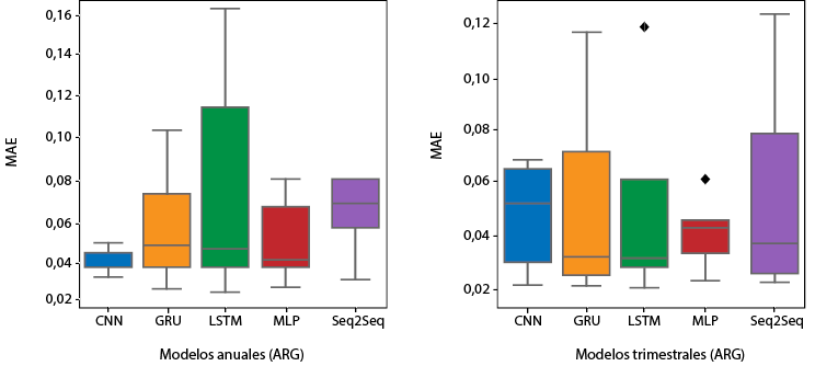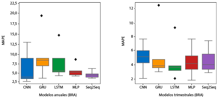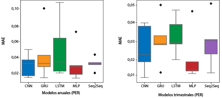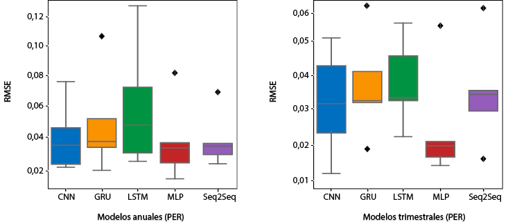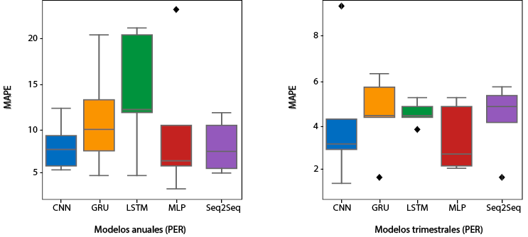 Según la tabla 13, en promedio, Seq2Seq tiene mejor desempeño en MAE y MAPE, y MLP en RMSE para datos anuales; mientras que, en trimestrales, MLP supera al resto. En las figuras 24, 25 y 26 se observan que los valores individuales de Seq2Seq no tienen mucha dispersión que los demás en datos anuales, y MLP tiene los valores más bajos en los datos trimestrales del PBI. La figura 27 pronostica el PBI, y en el modelo trimestral se sobreestima el valor predicho en los últimos años.