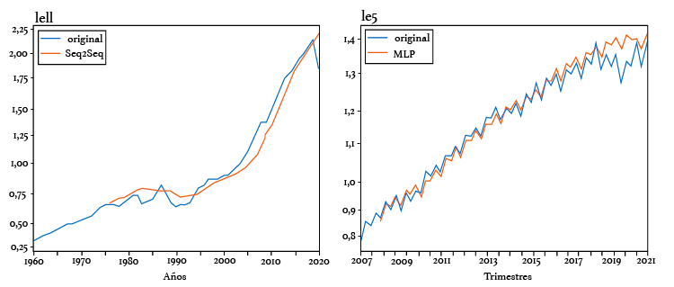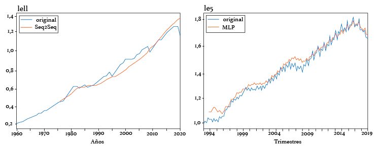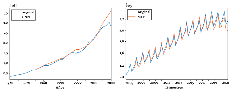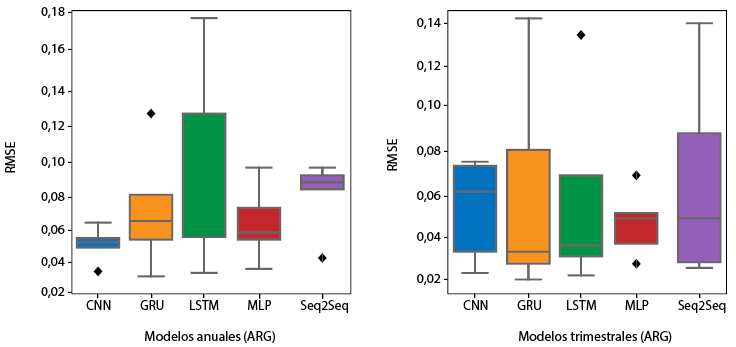 Cook y Smalter Hall (2017) predicen la tasa de desempleo la cual fue recolectada mensualmente por la Agencia Estadounidense de Trabajo y Estadísticas (US Bureau of Labor and Statistics). Se usaron modelos basados en diferentes arquitecturas de redes neuronales (perceptrón multicapa [MLP], red neuronal convolucional [CNN], long short-term memory [LSTM] y encoder-decoder [con LSTM]), y se compararon con el modelo estadístico DARM. La métrica empleada fue el error medio absoluto (MAE). Se resalta que la arquitectura encoder-decoder supera a los modelos de comparación en todos los horizontes de predicción (hasta cuatro trimestres).